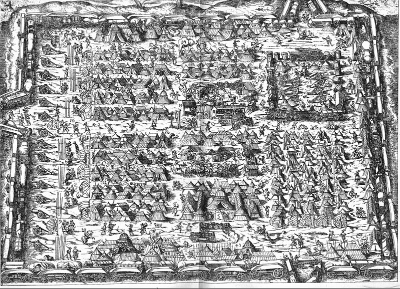 Feldlager im 16. Jhd. Faksimile der Radierung von Jost Amman (1531-1591); eingescannt aus: Henne am Rhyn, Dr. Otto: Kulturgeschichte des deutschen Volkes, Erster Band, Berlin, 1897., S. 482.