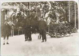 Manche Forstorte liegen so ungünstig, daß die Abfuhr des Holzes vorteilhaft bis zu guter Schlittenbahn aufgeschoben wird. An frosthellen Wintertagen begegnen uns oft ganze Karawanen, und wir müssen, da ein anderes Ausweichen unmöglich und von Rohrs‘ Urteil über die Fuhrknechte (siehe S. 149) noch immer nicht ganz unzutreffend ist, uns seitwärts in den tiefen Schnee stellen, bis die letzten Schlitten vorüber sind.